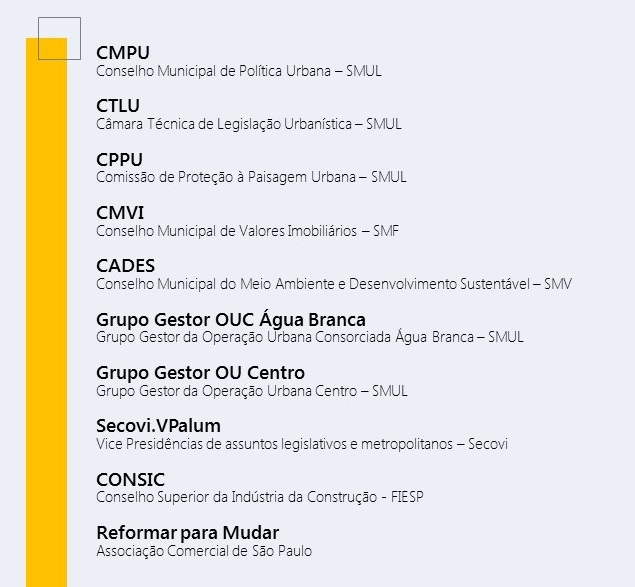 Confira as Representações CPU nos conselhos, comitês e comissões urbanas da cidade de São Paulo: