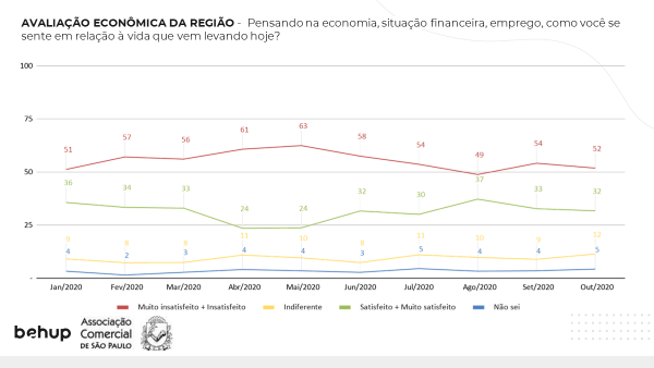 Na pesquisa, foi perguntado às famílias sua percepção sobre a economia, sua situação financeira, emprego e em como se sentiam em relação à vida que leva hoje. Do total, 52% mostraram-se muito insatisfeitos ou insatisfeitos. No mês passado, eram 54% que estavam dentro deste perfil. O pico foi em maio, com 63%. Os que afirmam estarem satisfeitos, no entanto, somaram 32% dos pesquisados, número menor que o de agosto (37%).