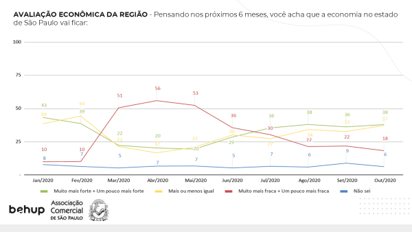 Foi também perguntado aos consumidores se eles acham que, em seis meses, a economia do Estado de São Paulo ficará mais fraca (muito ou um pouco mais), se será parecida com o que já é, ou se estará muito mais forte. Os entrevistados que responderam que tudo estará pior, concentraram-se mais em março, abril e maio (com 51, 56 e 53 por cento respectivamente). Nos meses subsequentes, houve melhora gradativa da confiança. Em agosto e setembro, havia apenas 22% de pessoas que viam a situação da pior forma possível, e, agora, o percentual caiu para 18%. Apesar disso, o número de pessoas que projetam um futuro melhor e as que acham que vai ficar tudo como está é quase o mesmo: 38% de otimistas e 37%, para quem vislumbra igual ao presente o período que vai chegar.