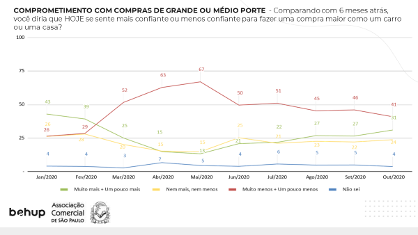 De maio pra cá, também aumentou a porcentagem de pessoas que estão dispostas a fazer uma compra de maior valor como um carro ou uma casa. Os pesquisadores perguntaram se, comparado há seis meses, o consumidor estaria mais confiante para este tipo de aquisição. Naquele mês havia apenas 13% de entrevistados que diziam estar animados para tal iniciativa. Em junho, houve um salto para 21% e, hoje, já está em 31%. “O auxílio emergencial de R $600, do Governo Federal, que beneficiou principalmente a Classe C, ajudou as pessoas a planejarem as compras, mesmo aquelas de maior valor”, avaliou Ruiz de Gamboa.