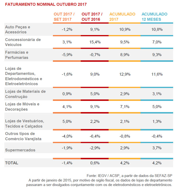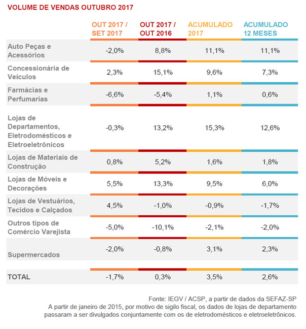 Durante o período janeiro-outubro de 2017, as vendas do varejo restrito (que não incluem veículos e material de construção) e do varejo ampliado (que inclui todos os setores) do Estado de São Paulo continuaram aumentando (2,6% e 3,5%, respectivamente), de forma mais intensa do que a observada na leitura anterior (2,5% e 3,2%, respectivamente).
