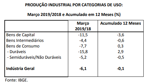 De acordo com a Pesquisa Mensal da Indústria (PMI) do Instituto Brasileiro de Geografia e Estatística (IBGE), em março, a produção industrial mostrou queda de 6,1%, em relação ao mesmo mês do ano passado, enquanto no acumulado em 12 meses houve contração de 0,1%, a primeira desde agosto de 2017, nessa mesma base de comparação (ver tabela abaixo).