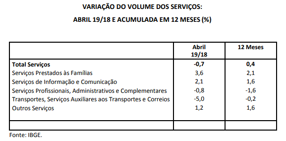 De acordo com a Pesquisa Mensal de Serviços (PMS), divulgada pelo Instituto Brasileiro de Geografia e Estatística (IBGE), em abril, o volume de serviços prestados mostrou queda de 0,7% na comparação com o mesmo mês de 2018 (ver tabela abaixo), menos intensa do que a observada em março, na mesma base de comparação (-2,3%). Contudo, no acumulado em 12 meses houve alta de 0,4%, porém, inferior à registrada na última leitura, o que sinaliza a perda de “fôlego” que continua sofrendo o setor.