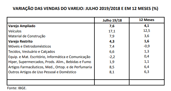O melhor desempenho do varejo pode ser explicado pelo aumento da concessão de crédito à pessoa física, pelo leve recuo do desemprego e pela existência de um dia útil adicional em julho deste ano. Em todo caso, o consumidor continua pouco confiante, privilegiando as compras de itens mais básicos, o que explicaria a elevação das vendas dos artigos farmacêuticos e de outros artigos de uso pessoal e doméstico, em termo anuais. Por sua vez, a maior disponibilidade de crédito contribuiria para o maior volume comercializado de itens cuja compra depende relativamente mais de financiamento: móveis e eletrodomésticos; tecidos, calçados e vestuário; material de construção e veículos.