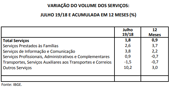 Em julho, o volume total de serviços prestados apresentou alta de 1,8%, sobre o mesmo mês do ano passado (ver tabela abaixo), segundo a Pesquisa Mensal de Serviços(PMS), divulgada pelo Instituto Brasileiro de Geografia e Estatística (IBGE). O segmento de transportes, que é o mais importante da amostra utilizada pela PMS, foi o único dos cinco considerados que mostrou queda, mantendo-se a mesma base de comparação. No acumulado de 12 meses, houve aumento de 0,9%, levemente superior à leitura anterior (0,7%).