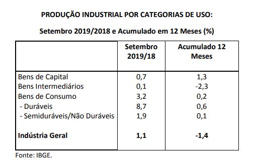 No comparativo anual, todas as categorias de uso apresentaram elevação, destacando-se a produção de bens de consumo durável, notadamente veículos, artigos eletrônicos e móveis. Esses resultados se devem, em grande parte, à existência de dois dias úteis adicionais em setembro deste ano. O setor ainda opera com grande ociosidade, devido à fraca demanda interna, à redução do setor extrativo mineral, em decorrência do acidente de Brumadinho (MG), e à redução das exportações, principalmente aquelas destinadas ao mercado argentino.