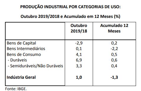 A atividade industrial cresceu 1,0%, em outubro, na comparação com o mesmo mês do ano passado, segundo o Instituto Brasileiro de Geografia e Estatística – IBGE (ver tabela abaixo). No acumulado dos últimos 12 meses, continuou havendo contração, porém cada vez menos intensa (-1,3%).
