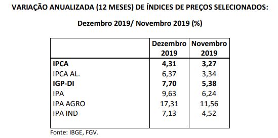 De acordo com o Instituto Brasileiro de Geografia e Estatística (IBGE), o Índice Nacional de Preços ao Consumidor Amplo (IPCA) apresentou forte elevação no mês de dezembro, refletindo o aumento dos preços dos alimentos, principalmente em decorrência da elevação dos preços da carne, dos transportes, devido à pressão exercida pelos reajustes da gasolina, do etanol e das passagens aéreas e das despesas pessoais, afetadas pelo maior custo da loteria. Esses resultados provocaram aceleração na inflação anual (12 meses), que terminou 2019 em 4,31% (ver tabela), pouco acima da meta perseguida pelo Banco Central (4,25%).