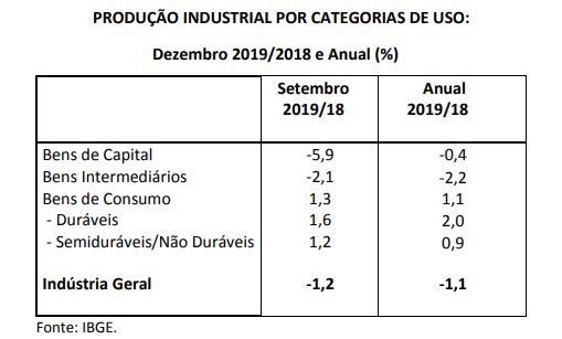 Segundo o Instituto Brasileiro de Geografia e Estatística (IBGE), em 2019, a indústria mostrou contração de 1,2%, na comparação com o mesmo mês do ano passado (ver tabela abaixo). Durante 2019 houve queda de 1,1% na produção, após haver mostrado expansão nos últimos dois anos (2,5% e 1,0%, respectivamente).