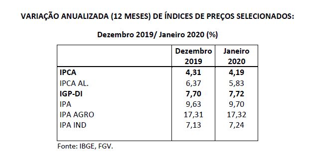 Em síntese, em janeiro, a inflação oficial, medida pelo IPCA apresenta claros sinais de desaceleração. A pressão exercida pelos preços do grupo alimentação e bebidas no final do ano passado começa a refluir, com nova safra recorde, enquanto o preço do petróleo nos mercados internacionais apresentou forte queda, devido ao coronavírus. As elevadas cotações do dólar não deverão exercer impacto significativo sobre a alta dos preços, em tanto a elevada ociosidade da economia se mantenha.