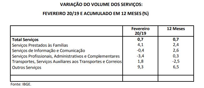 De acordo com o Instituto Brasileiro de Geografia e Estatística (IBGE), em fevereiro, o volume de serviços prestados aumentou 0,7%, ante igual mês de 2019 e no acumulado dos últimos 12 meses (ver tabela abaixo), mostrando “perda de fôlego” em relação a dezembro e janeiro últimos, mesmo antes do início do isolamento social.