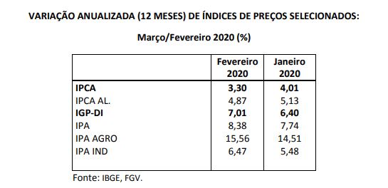 Segundo o Instituto Brasileiro de Geografia e Estatística (IBGE), em março, o Índice Nacional de Preços ao Consumidor Amplo (IPCA) apresentou alta de apenas 0,07%, desacelerando fortemente em relação a fevereiro, e ficando abaixo das expectativas, configurando a menor taxa de inflação desde o Plano Real. A inflação anual (12 meses) também mostrou forte desaceleração, alcançando a 3,3% (ver tabela abaixo), bem abaixo da meta anual perseguida pelo Banco Central (4,0%).