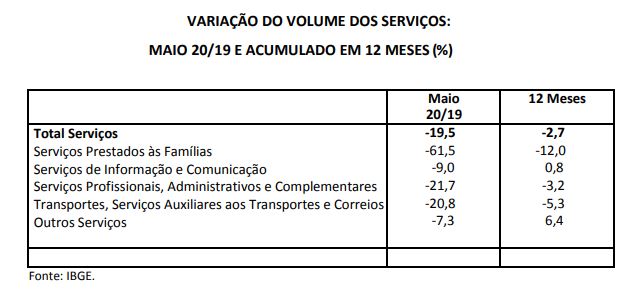 Em maio, de acordo com o Instituto Brasileiro de Geografia e Estatística (IBGE), o volume de serviços prestados mostrou recuo de 19,5% sobre o mesmo mês de 2019, abaixo das previsões do mercado (ver tabela abaixo), estabelecendo novo recorde negativo. No acumulado em 12 meses, também houve retração, que alcançou a 2,7%, intensificando o recuo observado na leitura anterior. O fato de ser o mais atingido pelo isolamento social, decretado para combater a pandemia, além da redução dos salários e do emprego, explicam essa intensificação da contração da atividade do setor.
