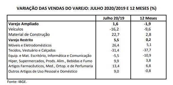 Em julho, o varejo restrito registrou alta de 5,5% sobre o mesmo mês de 2019, de acordo com o Instituto Brasileiro de Geografia e Estatística (IBGE), superando as expectativas. O varejo ampliado, que inclui veículos e material de construção, mostrou elevação de 1,6%. No acumulado do ano, houve recuos de 1,8% e 6,8%, respectivamente, enquanto em 12 meses, registraram-se crescimento de 0,2%, no primeiro caso, e queda de 1,9%, no segundo.