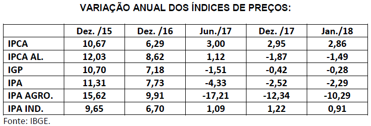 Como o IPA anualizado também continua no campo negativo em janeiro pode-se afirmar que os preços estão sob controle, graças, sobretudo, à forte queda dos preços agrícolas, mostrada pelo IPA AGRO que em janeiro foi de 10,29 negativo enquanto o IPA IND apresentou aumento de 0,91% no mês passado.