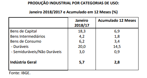 Em relação a janeiro de 2017, todas as quatro categorias registraram elevação, especialmente no caso dos bens de consumo duráveis (20,0%), destacando-se os segmentos veículos (27,4%) e informática e eletroeletrônicos (32,0%), com forte elevação da chamada “linha marrom” – televisores, som e vídeo (50,4%). Também houve maior produção de bens de capital (18,3%), principalmente direcionados a transporte (30,7%) e construção (81,4%). Na categoria de semiduráveis houve crescimento menos intenso (3,0%), pautado pelo comportamento do subsetor alimentos e bebidas (3,1%). Finalmente, também houve crescimento dos bens intermediários (4,2%), com destaque para peças de veículos (22,9%).