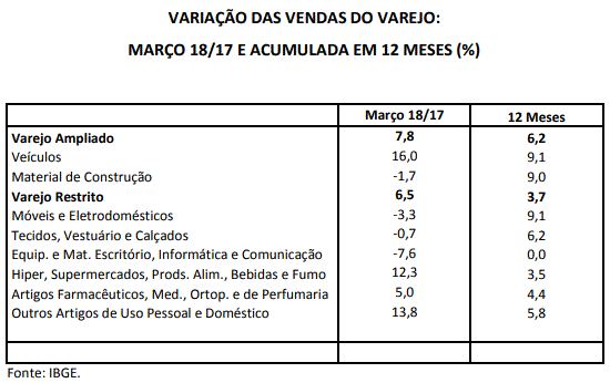 Em março, segundo o IBGE, as vendas do varejo restrito (que não considera veículos e material de construção) subiram 6,5%, superando as expectativas de mercado, constituindo o 12º crescimento consecutivo, na mesma base de comparação. No caso do varejo ampliado (que inclui todos os segmentos) também apresentou alta, que chegou a 7,8%. Nos últimos 12 meses, os volumes comercializados de ambos tipos de varejo continuam apresentando elevação (3,7% e 6,2%, respectivamente).